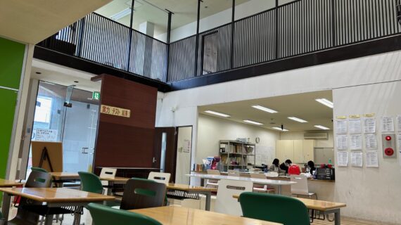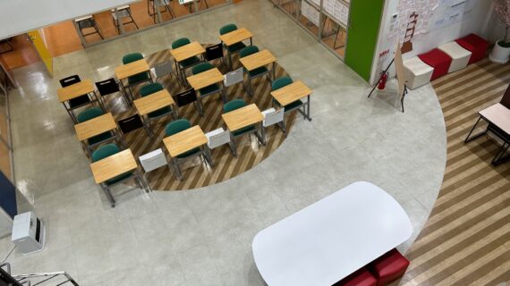 玄関に入ると吹き抜けの広いロビー。2階建ての校舎です。日曜日も開校しています!
